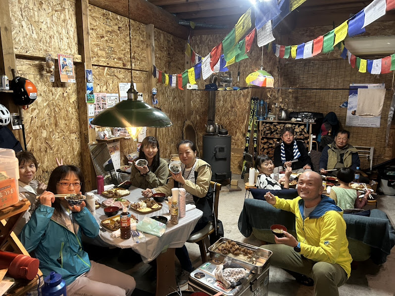 Day① 三鈷峰を目指してユートピア登山道を進みましたが、強風とガスによる視界不良、そして時間的にも山頂はあきらめて、ユートピア避難小屋で食事をとって引き返しました。下山後は「とやま旅館」で入浴し、宿泊地の「シタムラキャンプ場」に向かいました。シタムラキャンプ場に到着すると香茸の炊き込みご飯、から揚げ、大山ハム盛り合わせなど美味しい晩御飯を準備してくれていました。