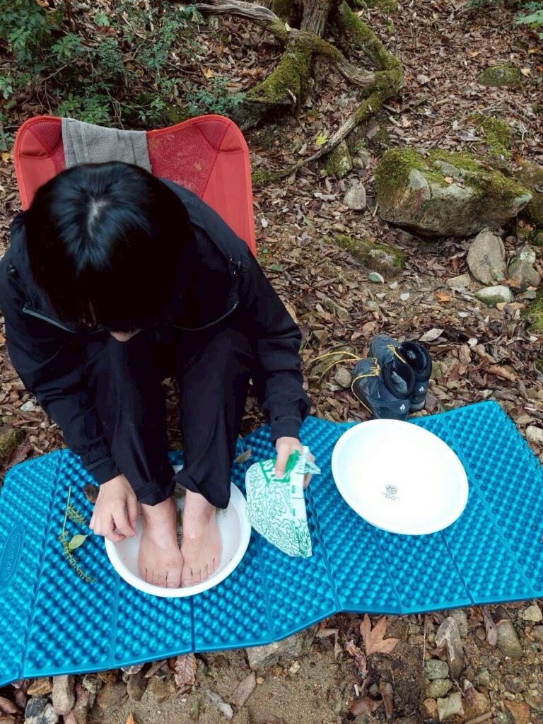 そしてバーナーとやかん、洗面器が出てきて、日本コバの源流の水を沸かして足湯「まほろばの湯」が出来上がり!持参したローズマリーと現地の紫蘇を使ったハーブの湯でリラックス効果も抜群だったようです。