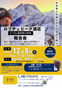 ナマステ!先日、ロブチェピーク6119mに無事に登頂、下山を果たした大森さんの「報告会」を開催します。 初の海外登山、ヒマラヤ、ネパールはどんな場所だったのか?帰国後間もない時期に本人からお話を聞かせていただきます。登山 […]
