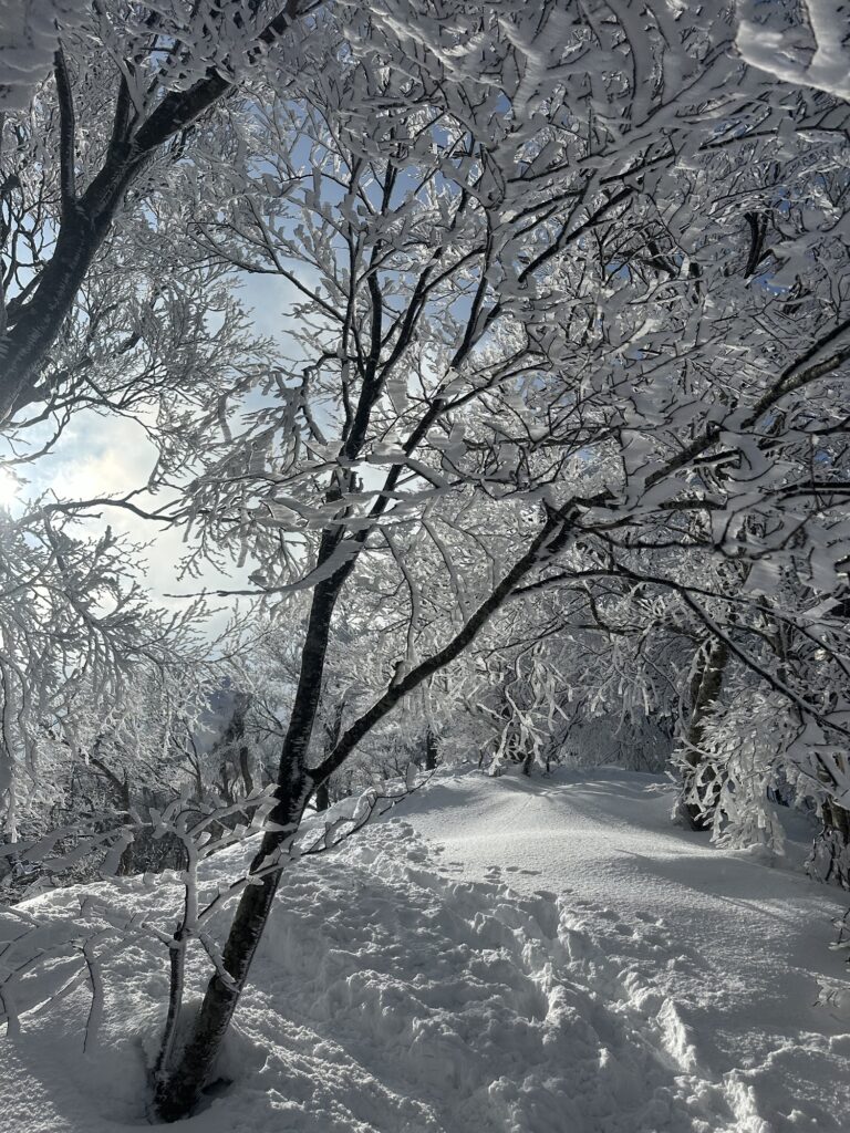 前半は美しいブナ林の中を進みます。木々を包む霧氷がとても綺麗で、幻想的な景色の中を歩いていきました。