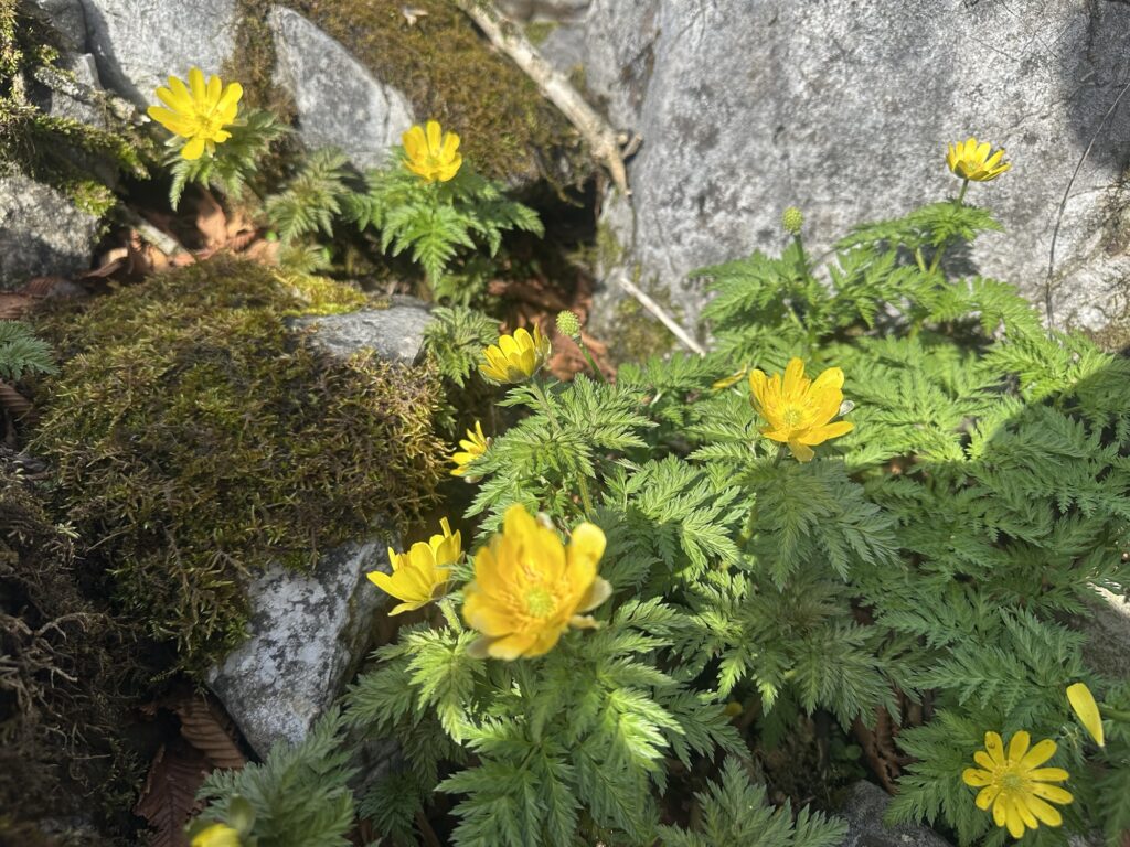 山頂付近では、ちょうど見頃を迎えた福寿草が多く見られ、春の訪れを感じました。
