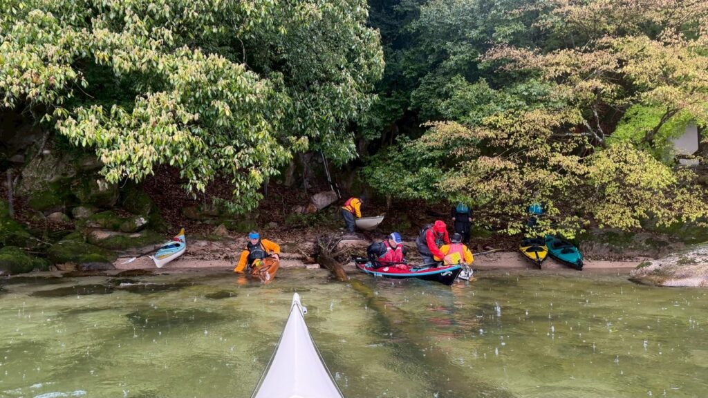 途中には、カヤックでしか行けない小さな浜に上陸して雨宿り。